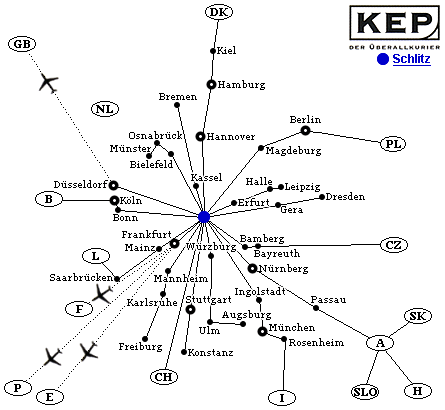 Nahezu unseren gesamten Express-Versand wickeln wir über unseren Kooperationspartner KEP GmbH ab, das Express-System für termingeführte Sendungen und Frachten. Die KEP AG arbeitet nach dem sogenannten HUB & Spoke – System, das heißt, alle Sendungen werden an einem Hauptumschlagplatz sortiert, gescannt und weiterverladen. Die Grafik unseres Liniensystems soll den Transportweg der Sendungen verdeutlichen.